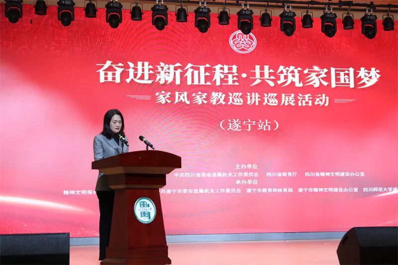 10月31日,“奋进新征程·共筑家国梦——家风家教巡讲巡展”活动走进遂宁。此次活动由四川省妇女联合会、中共四川省委省直属机关工作委员会、四川省教育厅、四川省精神文明建设办公室主办,精神文明报社、遂宁市妇女联合会、遂宁市委市直属机关工作委员会、遂宁市教育和体育局、遂宁市精神文明建设办公室、四川师范大学遂宁校区承办。